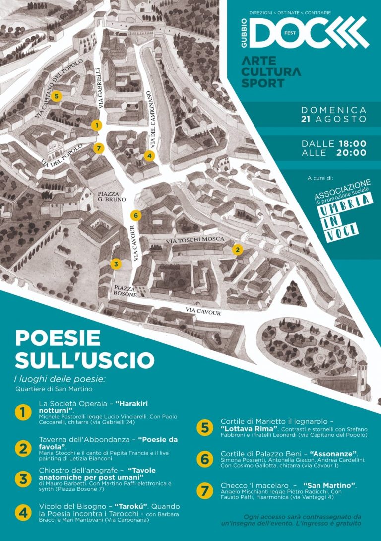 Il quartiere di San Martino è il protagonista di questo “esperimento” che unisce poesia e ospitalità. Sei poeti, collocati ognuno all’ingresso di un “uscio” di casa. Una mappa che guida il visitatore per vicoli e stradine, verso piccoli cortili, ingressi di grandi palazzi, negozi e androni. Un modo diverso di entrare in contatto con una parte antica e popolare di Gubbio, molto caratteristica, facendosi guidare dalla poesia. I poeti potranno essere accompagnati dalla musica oppure declamare semplicemente a nuda voce.